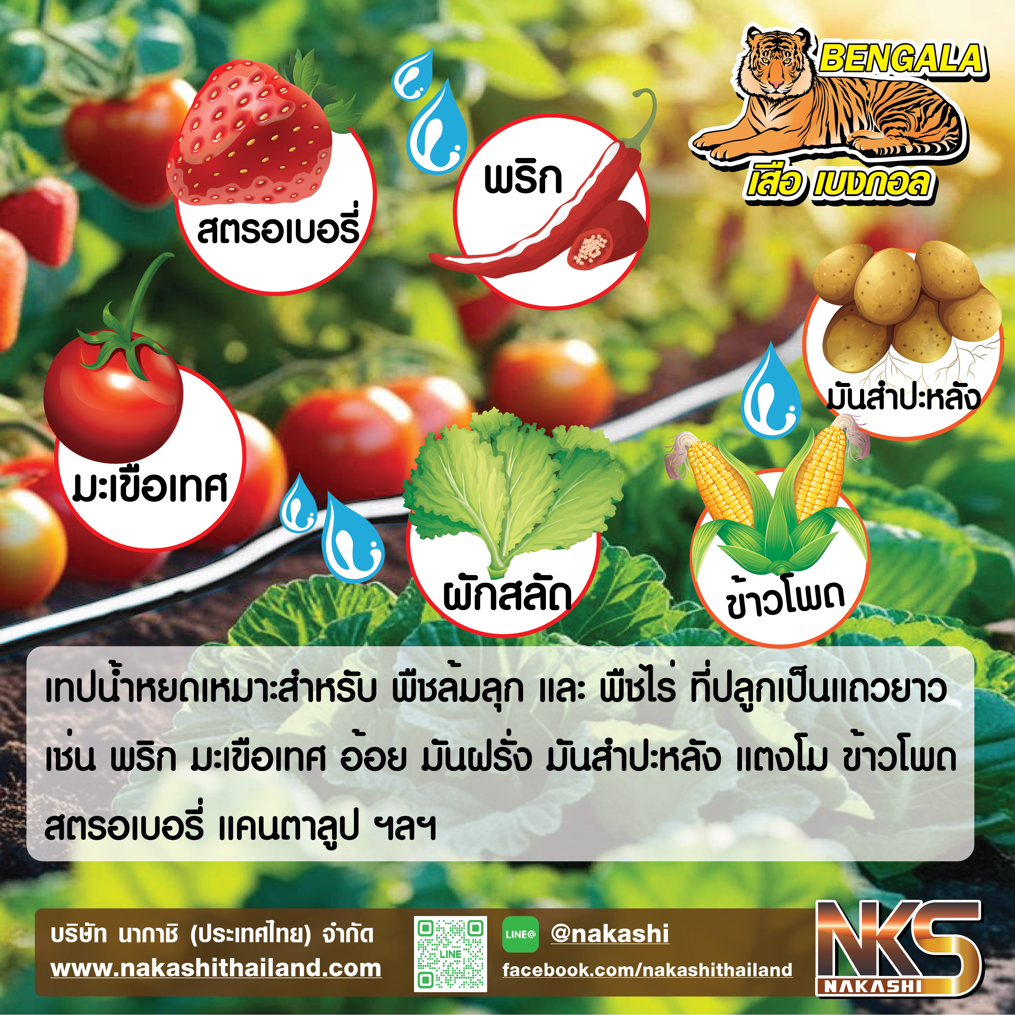 เทปน้ำหยดเหมาะสำหรับพืชล้มลุกและพืชไร่ที่ปลูกเป็นแถว เช่น