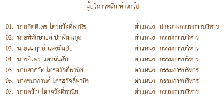 Mr.Kittidet Traisawatpanich (HAO) is chief executive with high experience in Trading business. Mr.Kittidet founded the business with his brothers since 1980 named "Architect group" focusing on iron rod, shaped iron, plywood, and construction materials. After that, the company grows rapidly and start import business from around the world to satisfy customers' need to get good quality product and reasonable price. Finally, Architect group has 12 companies that focused on difference product and market across Thailand.