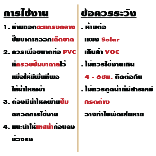 - ระหว่างการใช้งาน ตัวปั๊มจะต้องมีน้ำผ่านตลอดเวลา เมื่อน้ำใกล้แห้งแล้วให้ปิดเครื่องทันที เพื่อป้องกันความเสียหายจากความร้อน